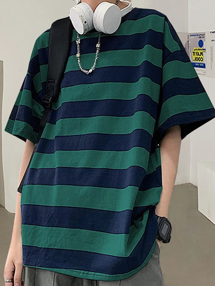 Summer Tshirt, Women's Color-Dyed Cotton Half Sleeve Tee, Striped, Loose, Fried Color Contrast Color O-Neck T-shirt